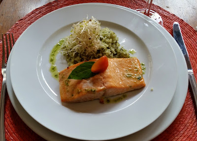 Eu pedi um salmão grelhado e arroz integral com brócolis e brotos de alfafa. E o marido pediu um cordeiro ao molho de vinho com quinoa e brotos de alfafa.